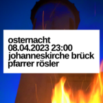 Am Karsamstag laden wir nachts ein um 23 Uhr in die Johanneskirche Brück zur Liturgie der Osternacht. Vor der Kirche brennt ein Feuer. Licht erhellt die Nacht. Im Dunkel und der Stille brennt es hell. Die Osterkerze wird neu am Feuer entzündet. Mit den kleinen Osterkerzen breitet es sich aus. In der Welt und in uns. Auferstehung. Neues Leben. Freude und Glück.