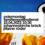 Am Ostermontag feiern wir weiter die Osterfreude mit einem Famliengottesdienst um 10.30 Uhr in der Johanneskirche Brück. Zusammen mit Kindern aus dem Kindergarten singen wir fröhliche Osterlieder. Wir erzählen die Geschichte Jesu bis zu seiner Auferstehung in Bildern. Und nach dem Gottesdienst geht es raus in den Garten, Ostereier suchen. Und es gibt Espresso aus unserer Maschine und leckeren frischen Osterzopf.