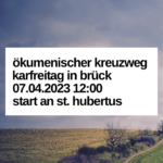Am Karfreitag feiern wir um die Mittagszeit ökumenisch den Kreuzweg in Brück. Beginn ist um 12 Uhr an der kath. Kirche St. Hubertus. Wir folgen Jesus in Stationen auf seinem Weg bis ans Kreuz und fragen: Was ist mein Weg? Woran habe ich zu tragen? Was ist unser Kreuzweg in unserem Alltag auf dieser Welt? Der Kreuzweg endet mit einem Agapemahl (Wasser und Brot) in der Johanneskirche.